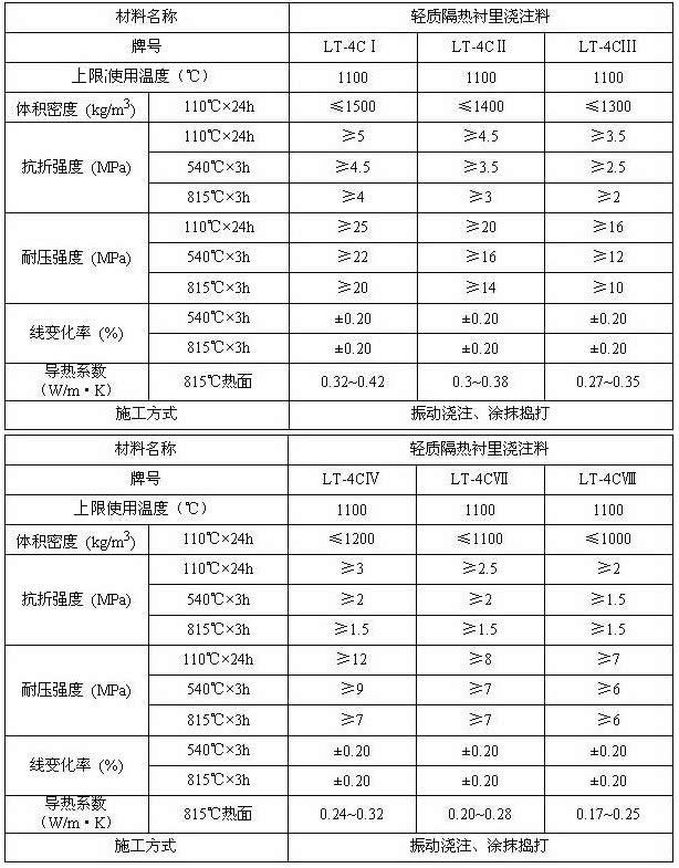 1)骨料均為中空、網格狀材結構,具有強度高,隔熱效果顯著,低導熱系數的特點。本系列產品根據導熱系數的不同,分為LT-4CⅠ到LT-4CⅧ幾種產品,作為隔熱襯里與GT-3A系列耐磨產品復合使用。