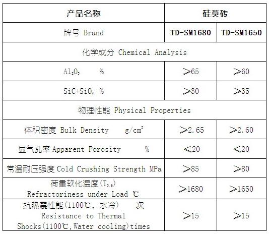 TD-SM硅莫磚是以特級高鋁鋁礬土和碳化硅為原料,經特殊燒結工藝制成,具有強度高、耐磨損、熱震穩定性特點,在使用過程中不斷形成保護層,減少結圈等特點。主要用于水泥回轉窯過渡帶、分解帶。