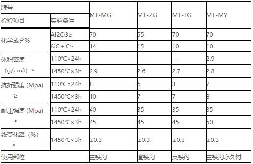 MT-MG推薦使用在大型高爐主鐵溝部位、也可以應(yīng)用于主溝沖擊區(qū)的修補(bǔ) , MT-TG 、 MT-ZG, MT-MY推薦使用在大型高爐永久襯部位。